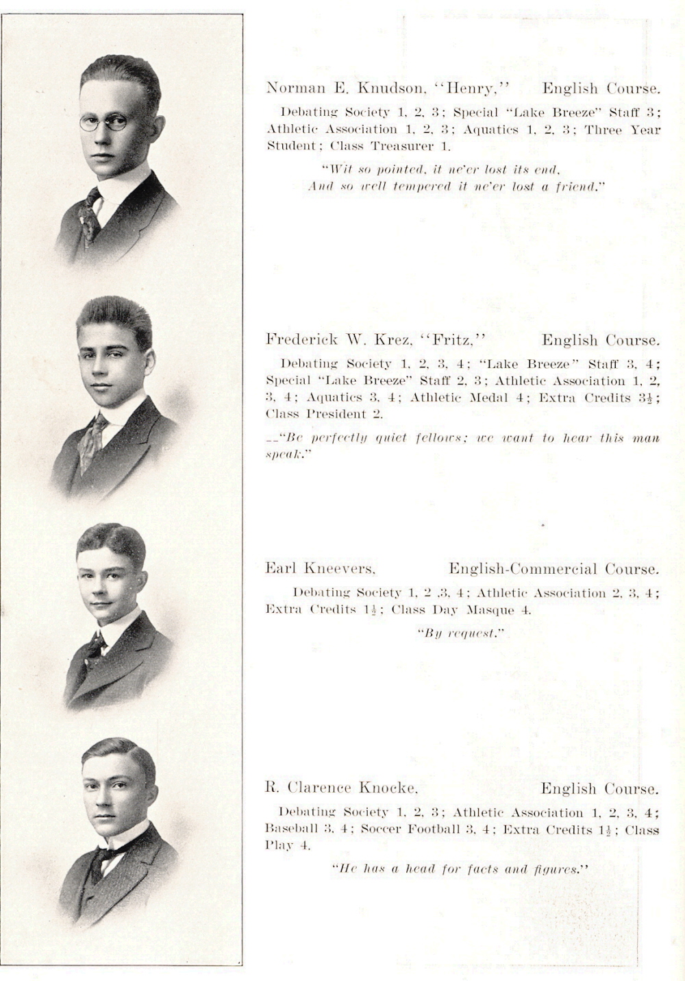 1916 Sheboygan High School, Page 18: Norman K. Knudson, Frederick W. Krez, Earl Kneevers, R. Clarence Knocke.