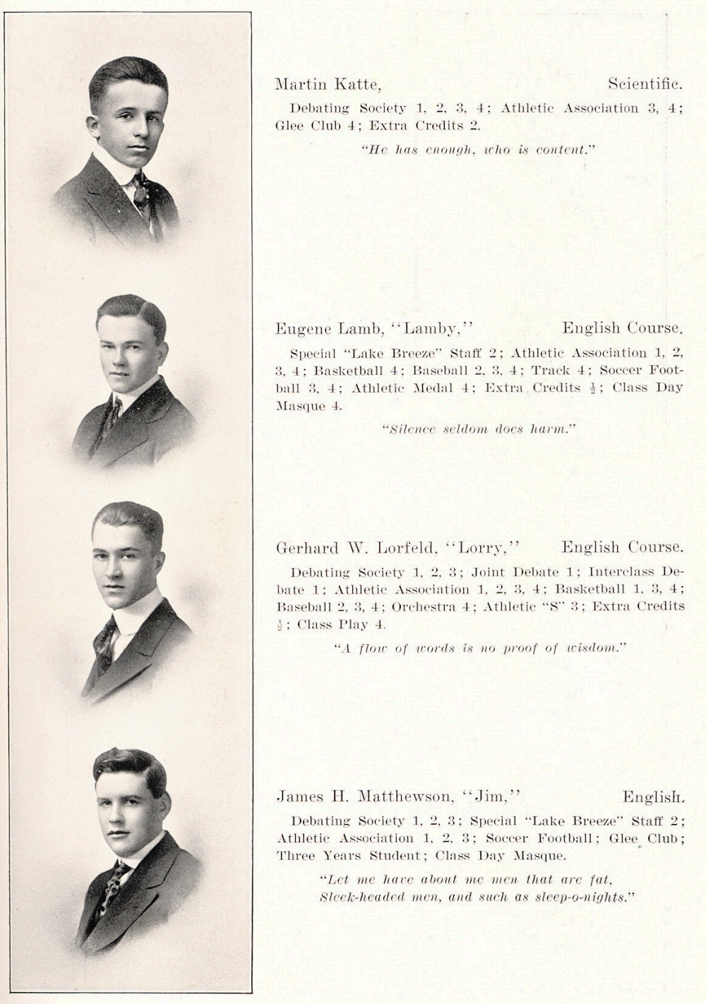 1916 Sheboygan High School, Page 19: Martin Katte, Eugene Lamb, Gerhard W. Lorfeld, James H. Matthewson.