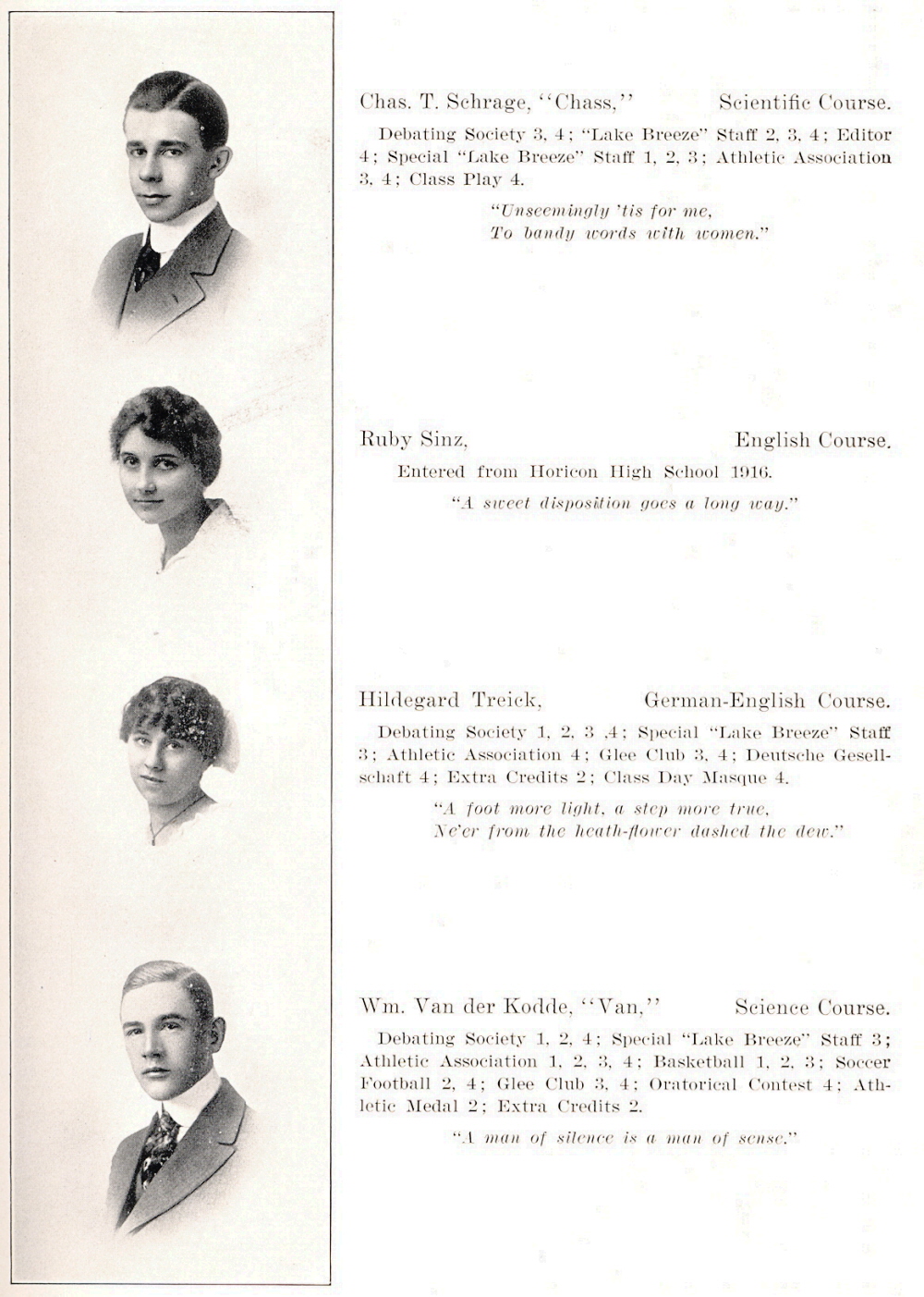 1916 Sheboygan High School, Page 23: Chas. T. Schrage, Ruby Sinz, Hildegard Treick, Wm. Van der Kodde.