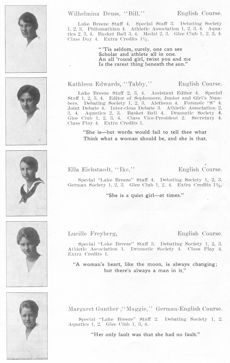 1917 Sheboygan High School, Page 13: Wilhelmina Deuss, Kathleen Edwards, Ella Eichstaedt, Lucille Freyberg, Margaret Gunther.