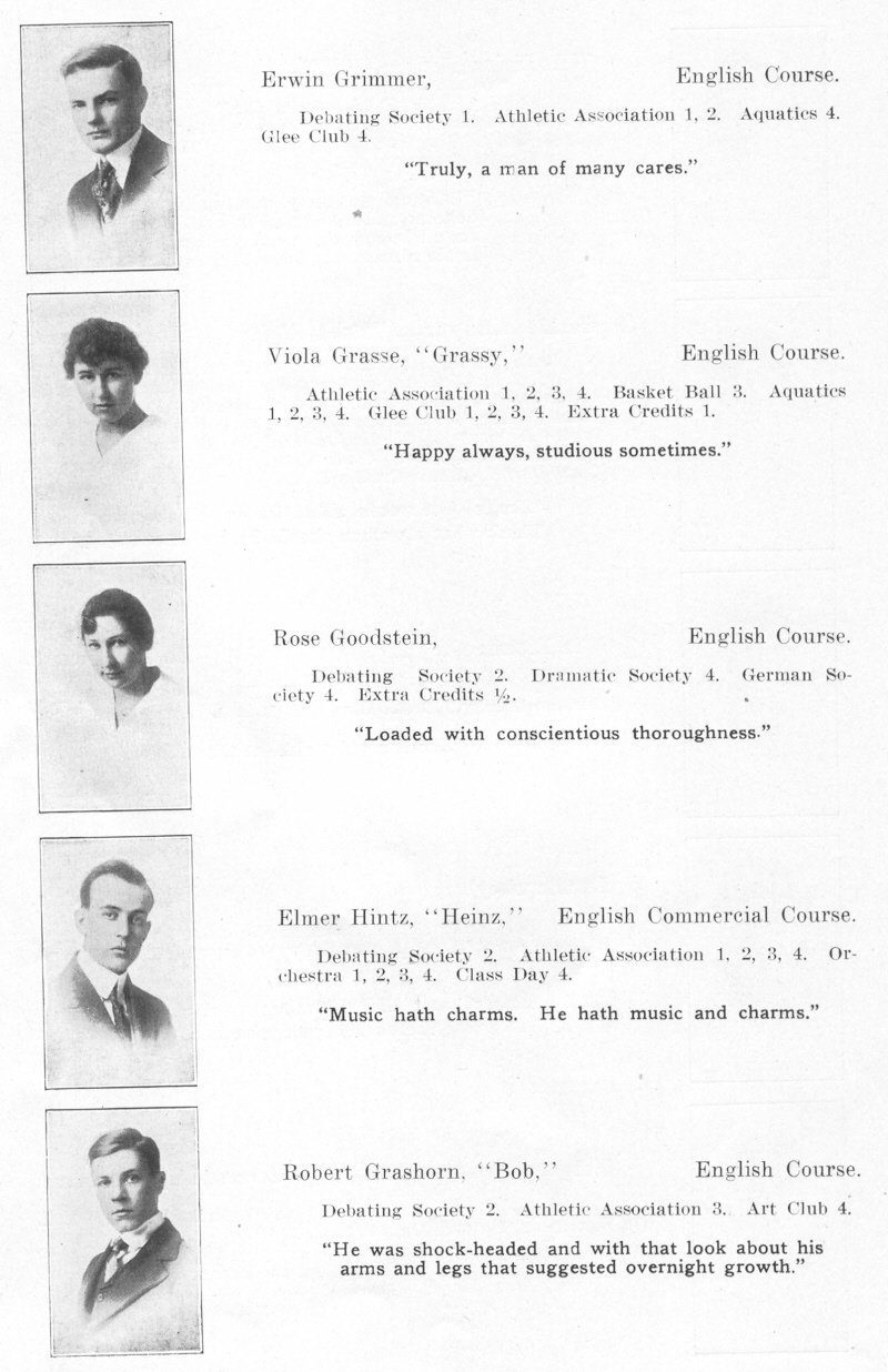 1917 Sheboygan High School, Page 14: Erwin Grimmer, Viola Grasse, Rose Goodstein, Elmer Hintz, Robert Grashorn.