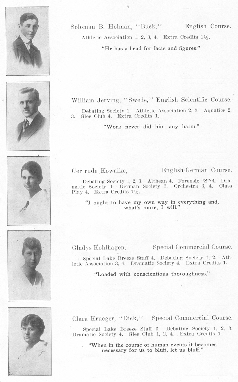 1917 Sheboygan High School, Page 16: Soloman Holman, William Jerving, Gertrude Kowalke, Gladys Kohlhagen, Clara Krueger.