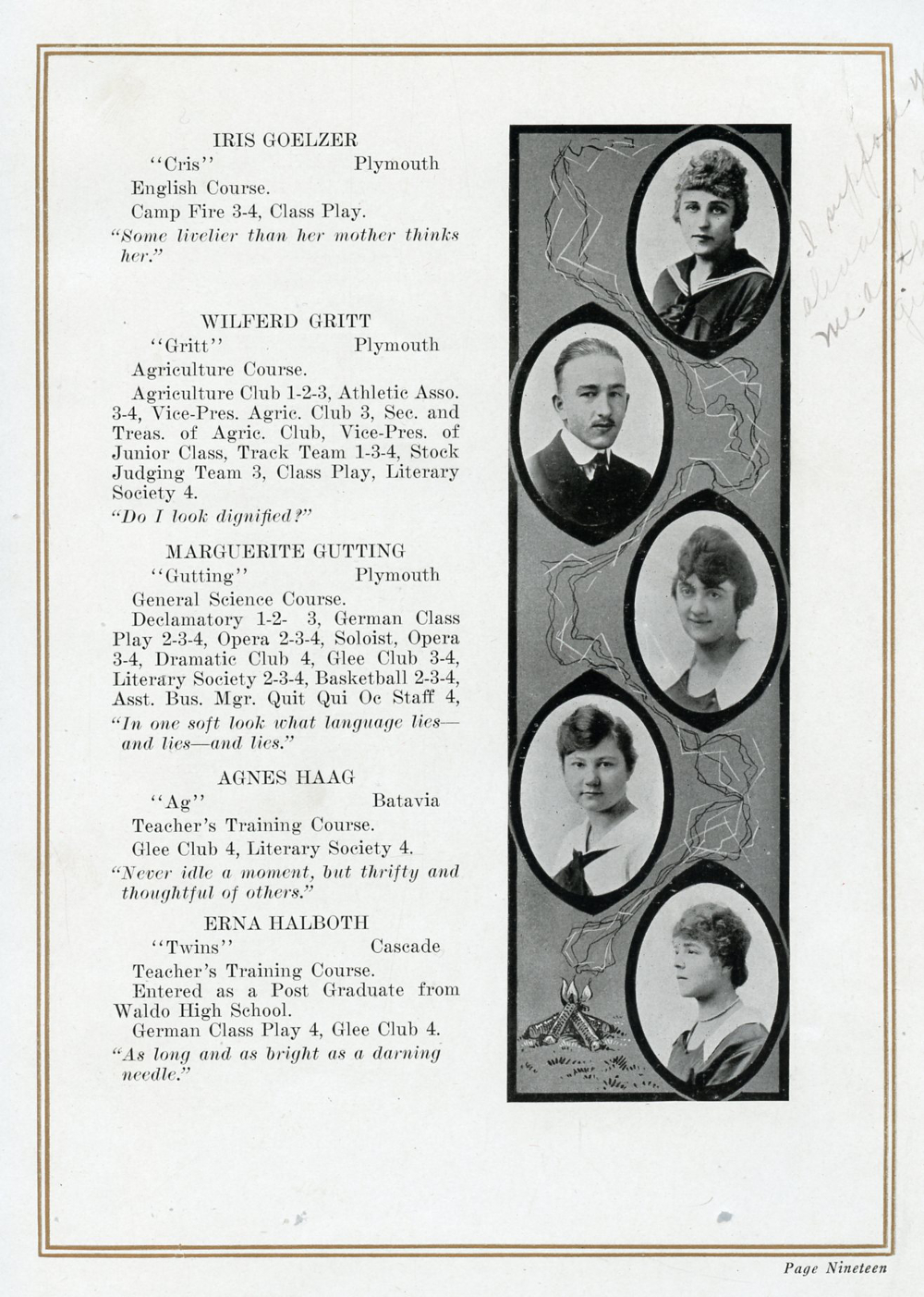 1918 Plymouth High School, Page 19: Iris Goelzer, Wilferd Gritt, Marguerite Gutting, Agnes Haag, Erna Halboth.