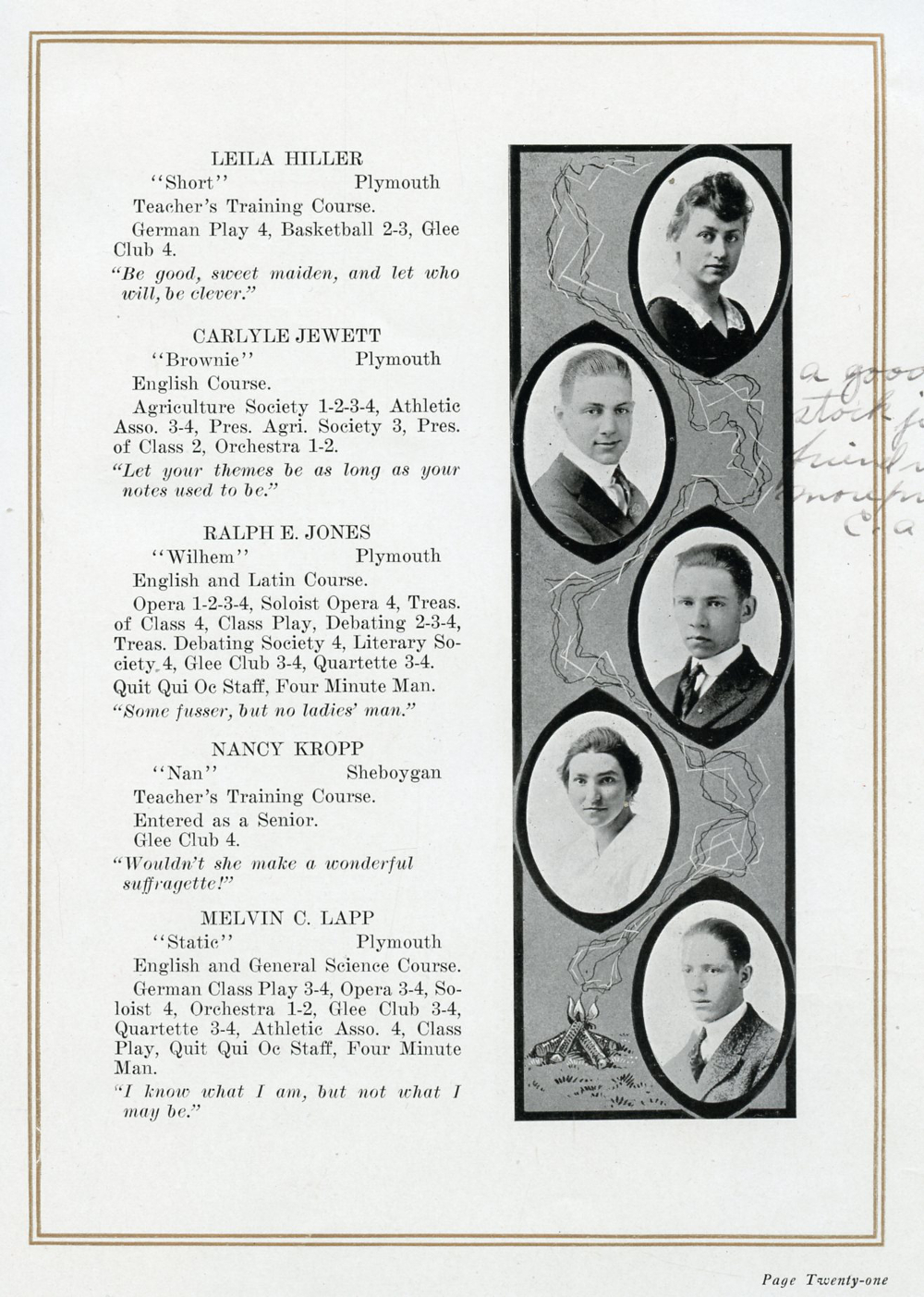 1918 Plymouth High School, Page 21: Leila Hiller, Carlyle Jewett, Ralph E. Jones, Nancy Kropp, Melvin C. Lapp.