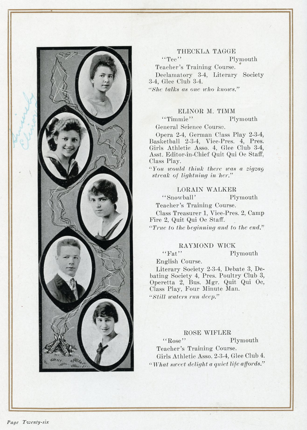 1918 Plymouth High School, Page 26: Theckla Tagge, Elinor M. Timm, Lorain Walker, Raymond Wick, Rose Wifler.