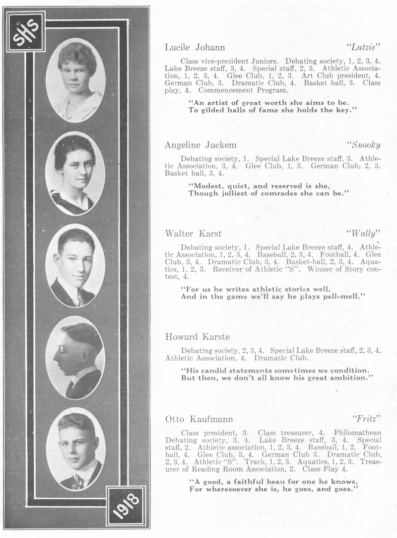 1918 Sheboygan High School, Page 15: Lucile Johann, Angeline Juckem, Walter Karst, Howard Karste, Otto Kaufmann.