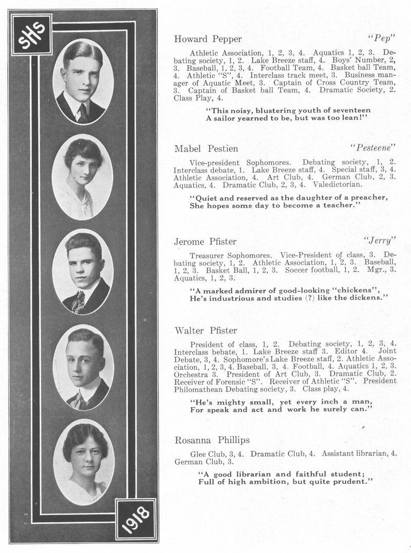 1918 Sheboygan High School, Page 19: Howard Pepper, Mabel Pestien, Jerome Pfister, Walter Pfister, Rosanna Phillips.