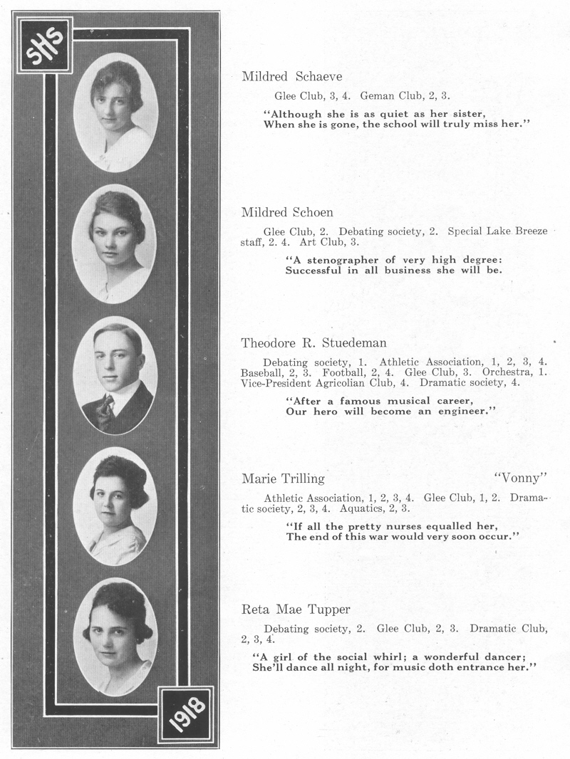 1918 Sheboygan High School, Page 21: Mildred Schaeve, Mildred Schoen, Theodore Stuedeman, Marie Trilling, Reta Mae Tupper.