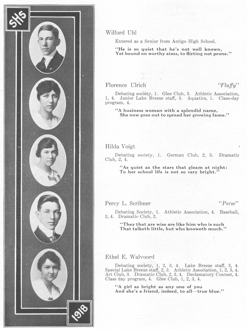 1918 Sheboygan High School, Page 22: Wilford Uhl, Florence Ulrich, Hilda Voigt, Percy Scribner, Ethel Walvoord.