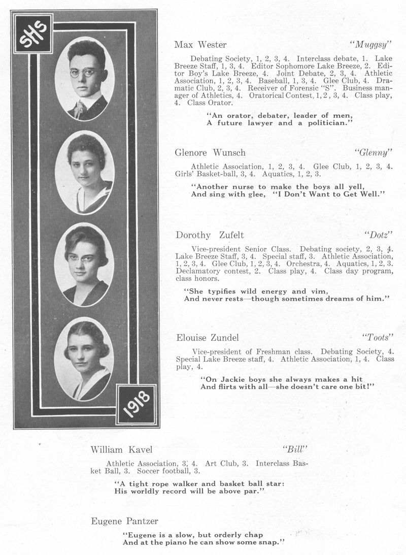 1918 Sheboygan High School, Page 23: Max Wester, Glenore Wunsch, Dorothy Zufelt, Elouise Zundel, William Kavel, Eugene Pantzer.