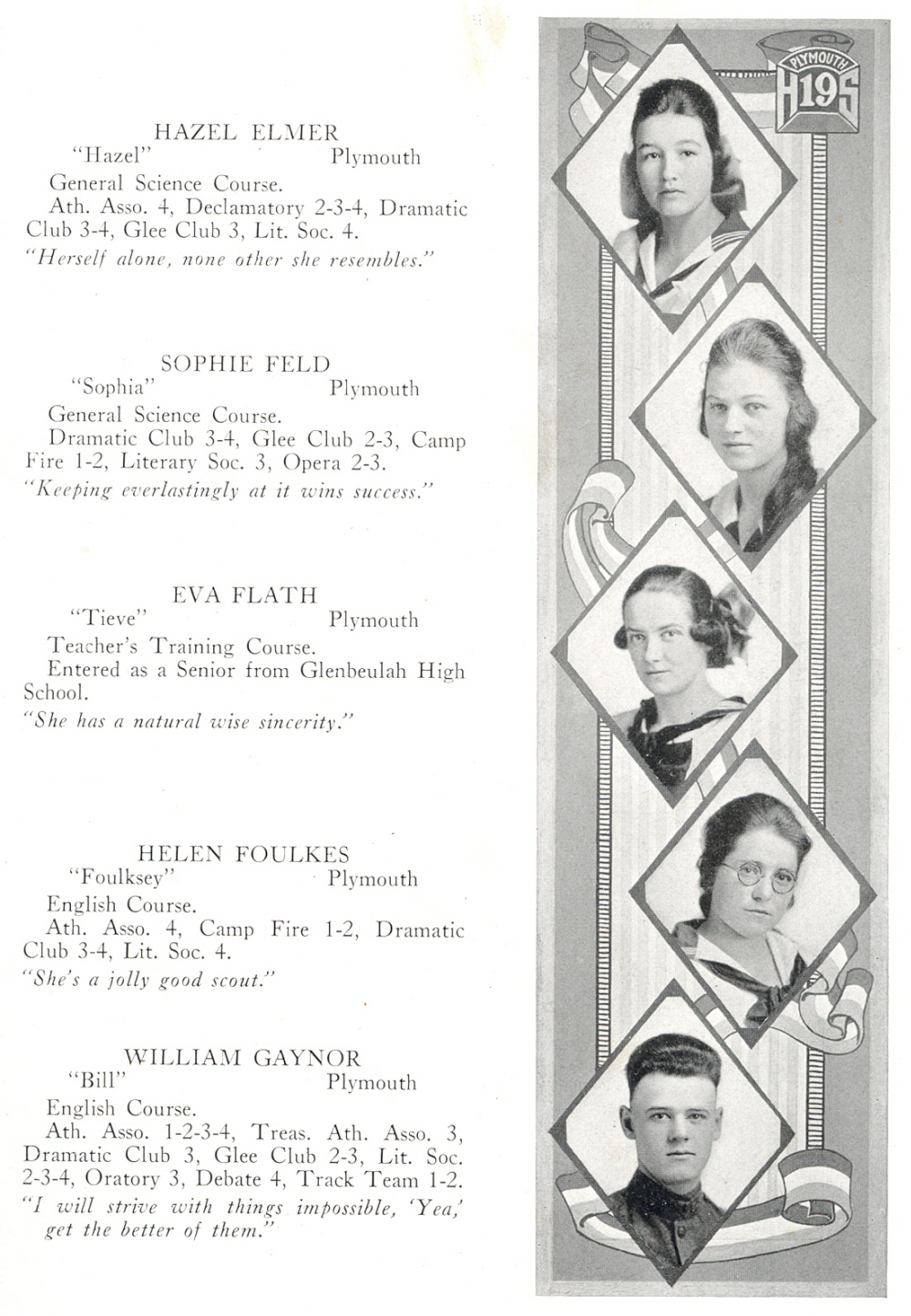 1919 Plymouth High School, Page 21: Hazel Elmer, Sophie Feld, Eva Flath, Helen Foulkes, William Gaynor.
