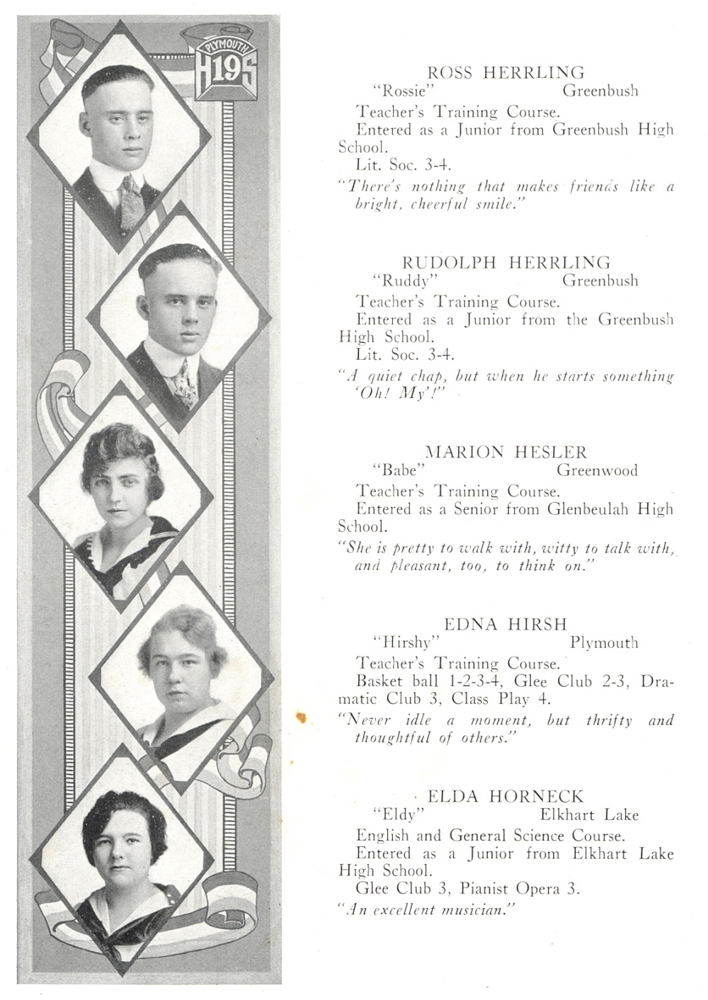 1919 Plymouth High School, Page 24: Ross Herrling, Rudolph Herrling, Marion Hesler, Edna Hirsh, Elda Horneck.