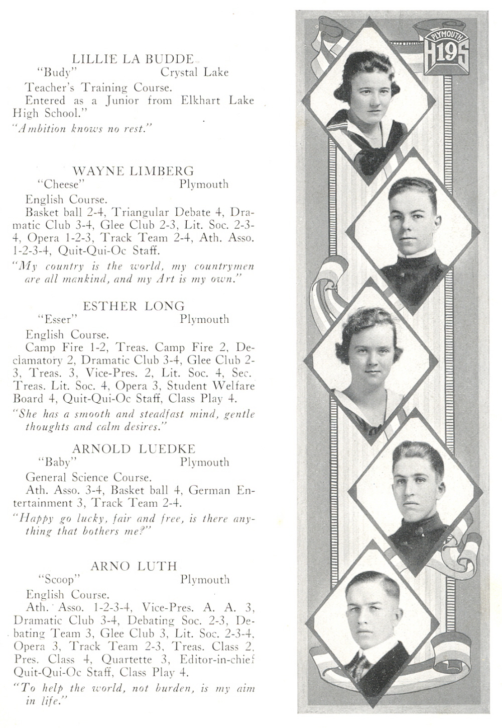 1919 Plymouth High School, Page 27: Lillie La Budde, Wayne Limberg, Esther Long, Arnold Luedke, Arno Luth.