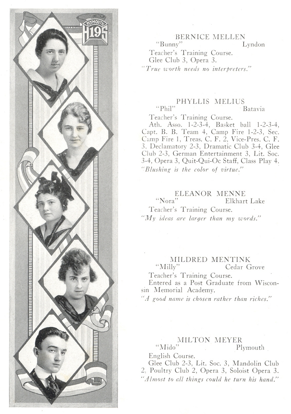 1919 Plymouth High School, Page 28: Bernice Mellen, Phyllis Melius, Eleanor Menne, Mildred Mentink, Milton Meyer.