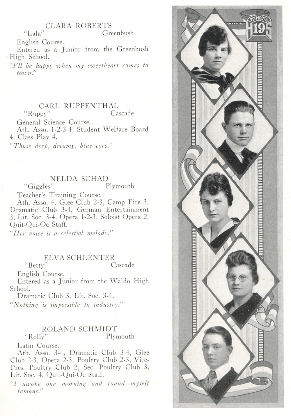 1919 Plymouth High School, Page 31: Clara Roberts, Carl Ruppenthal, Nelda Schad, Elva Schlenter, Roland Schmidt.