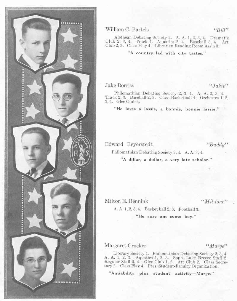 1919 Sheboygan High School, Page 10: William Bartels, Jake Borriss, Edward Beyerstedt, Milton Bennink, Margaret Crocker.