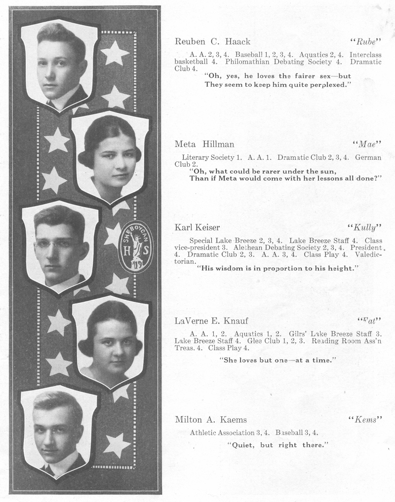 1919 Sheboygan High School, Page 13: Reuben Haack, Meta Hillman, Karl Keiser, LaVerne Knauf, Milton Kaems.