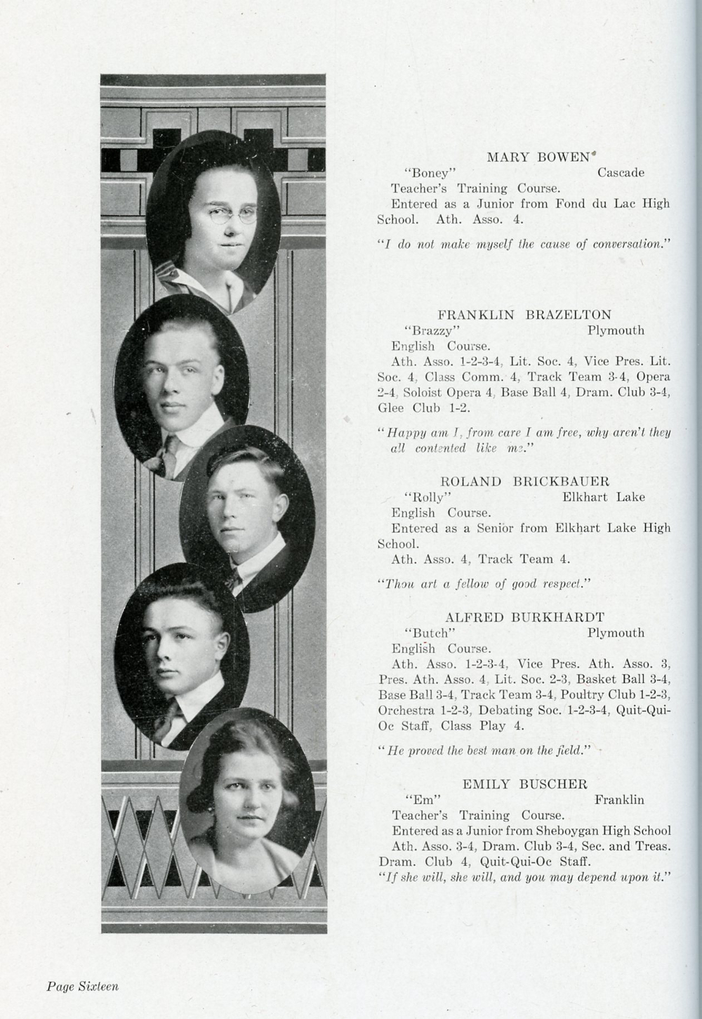 1920 Plymouth High School, Page 16: Mary Bowen, Franklin Brazelton, Roland Brickbauer, Alfred Burkhardt, Emily Buscher.