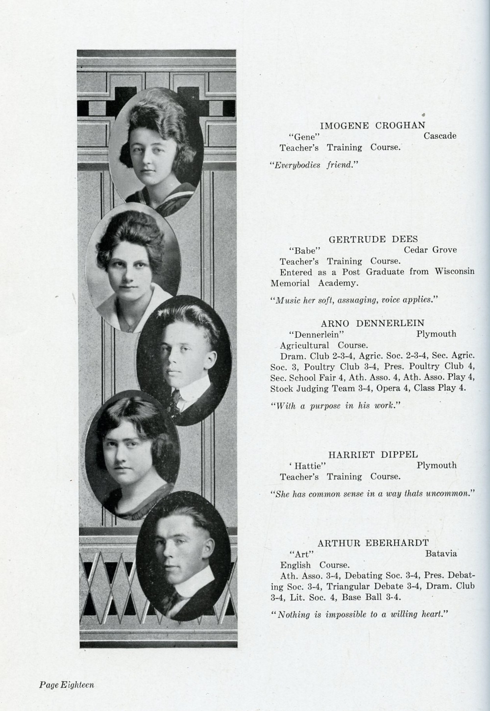 1920 Plymouth High School, Page 18: Imogene Croghan, Gertrude Dees, Arno Dennerlein, Harriet Dippel, Arthur Eberhardt.