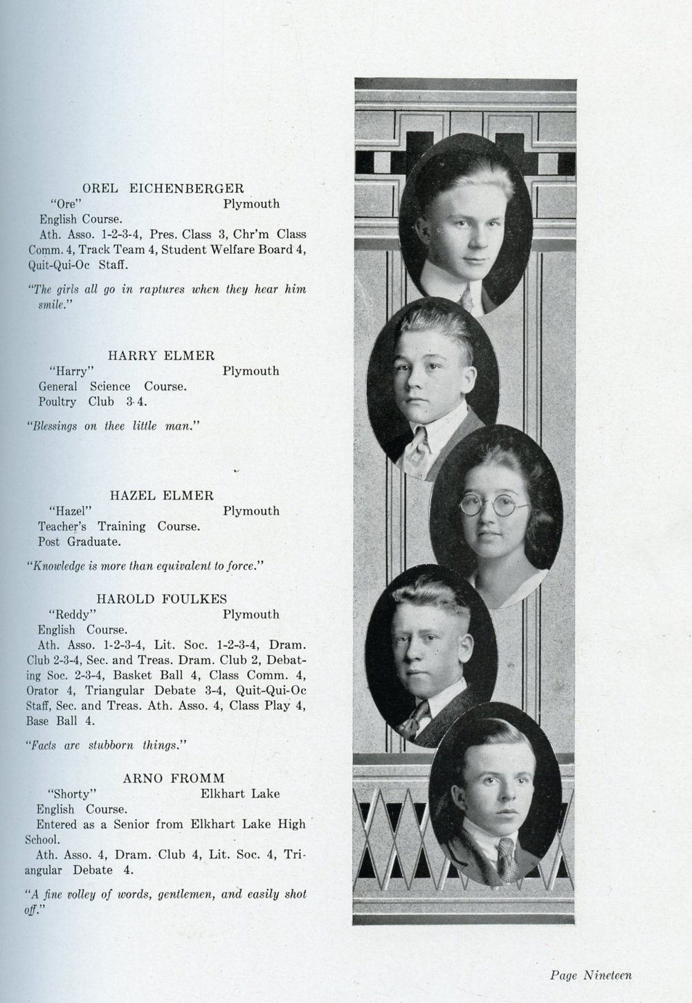 1920 Plymouth High School, Page 19: Orel Eichenberger, Harry Elmer, Hazel Elmer, Harold Foulkes, Arno Fromm.