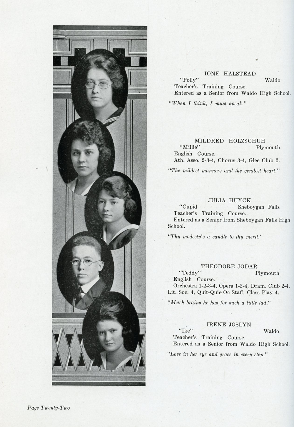 1920 Plymouth High School, Page 22: Ione Halstead, Mildred Holzschuh, Julia Huyck, Theodore Jodar, Irene Joslyn.