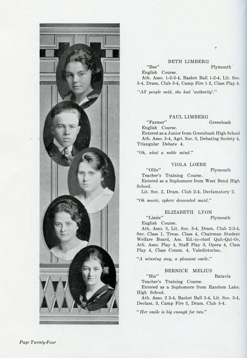 1920 Plymouth High School, Page 24: Beth Limberg, Paul Limberg, Viola Loebe, Elizabeth Lyon, Bernice Melius.