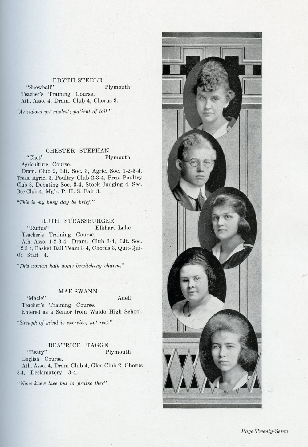 1920 Plymouth High School, Page 27: Edyth Steele, Chester Stephan, Ruth Strassburger, Mae Swann, Beatrice Tagge.