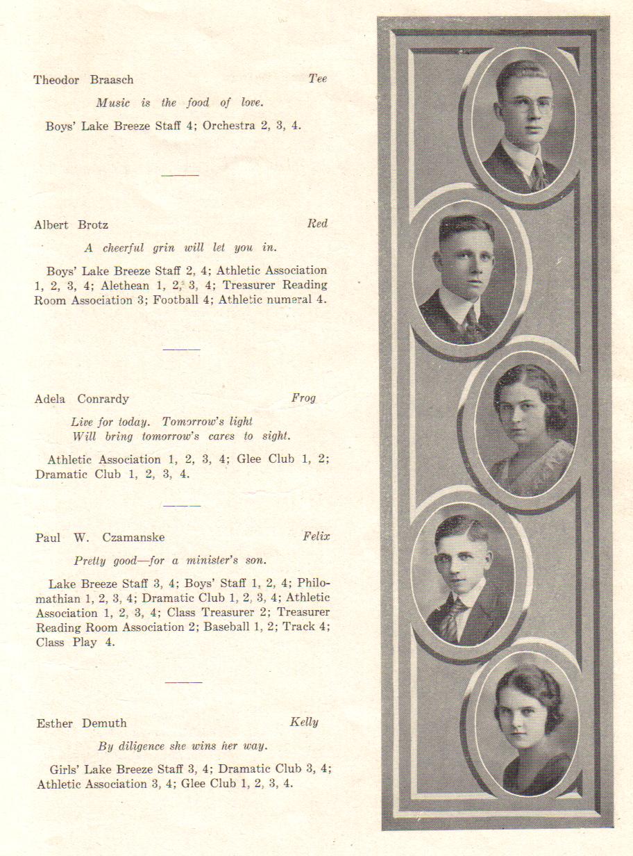 1920 Sheboygan High School, Page 13: Theodor Braasch, Albert Brotz, Adela Conrardy, Paul Czamanske, Esther Demuth.