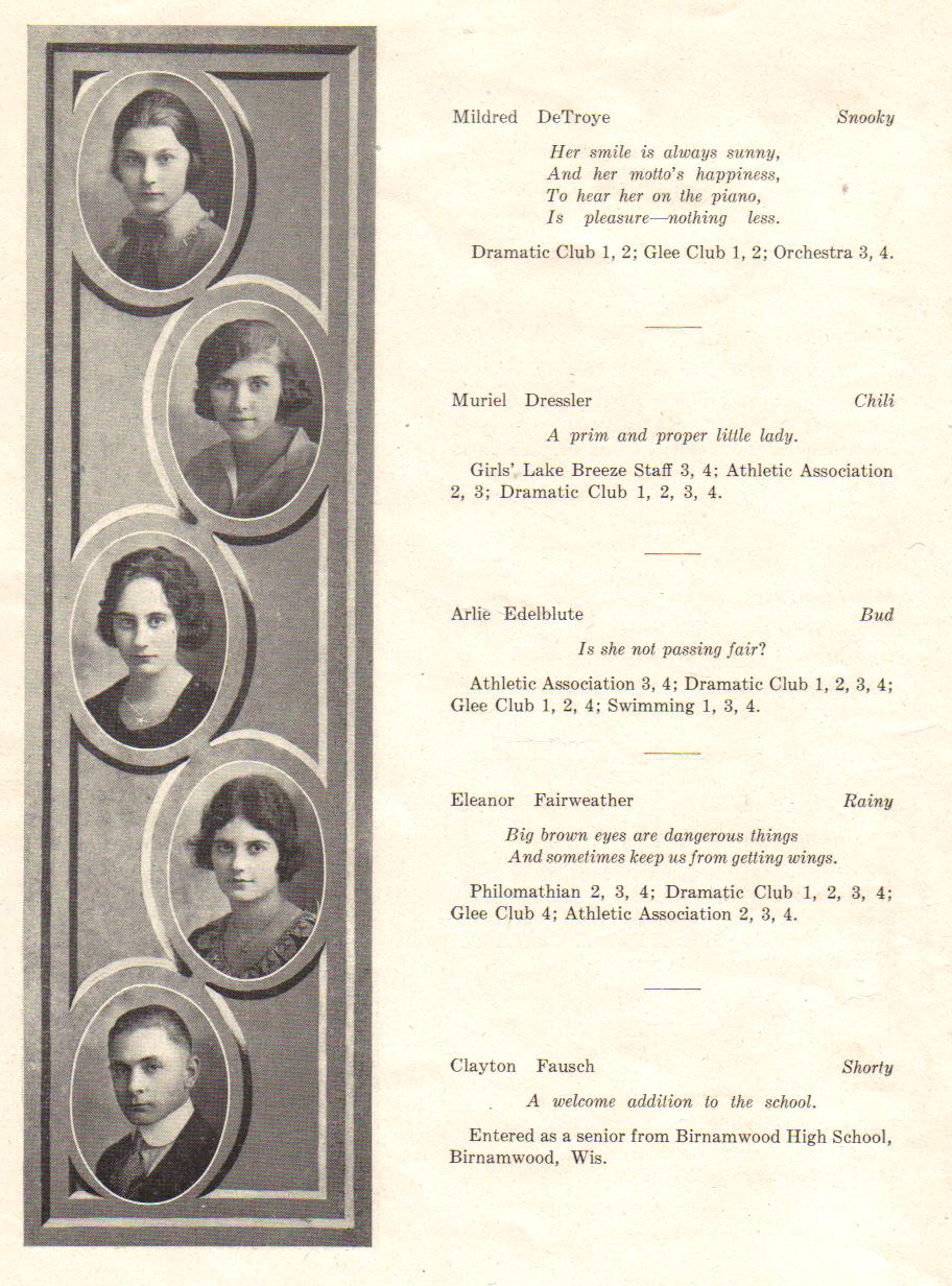 1920 Sheboygan High School, Page 14: Mildred DeTroye, Muriel Dressler, Arlie Edelblute, Eleanor Fairweather, Clayton Fausch.