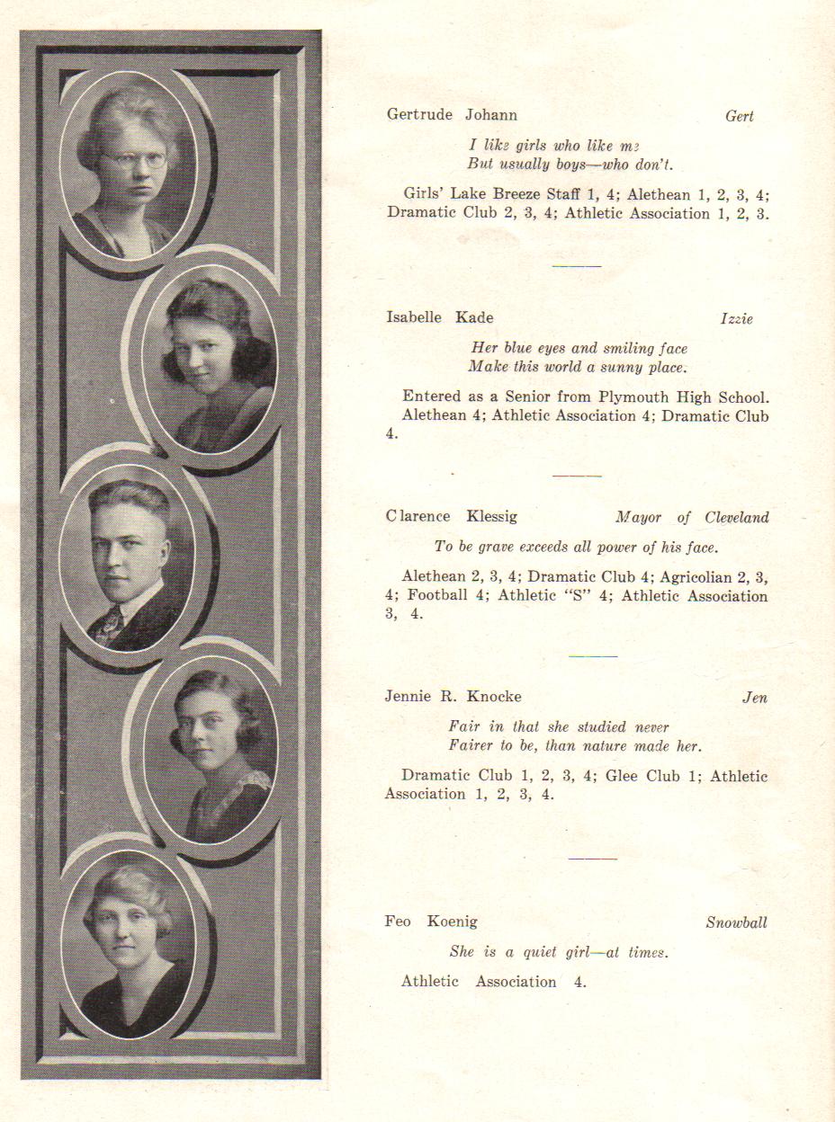 1920 Sheboygan High School, Page 18: Gertrude Johann, Isabelle Kade, Clarence Klessig, Jennie Knocke, Feo Koenig.