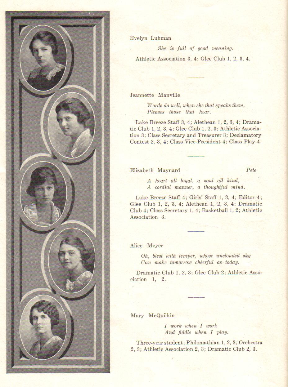 1920 Sheboygan High School, Page 20: Evelyn Luhman, Jeannette Manville, Elizabeth Maynard, Alice Meyer, Mary McQuilkin.