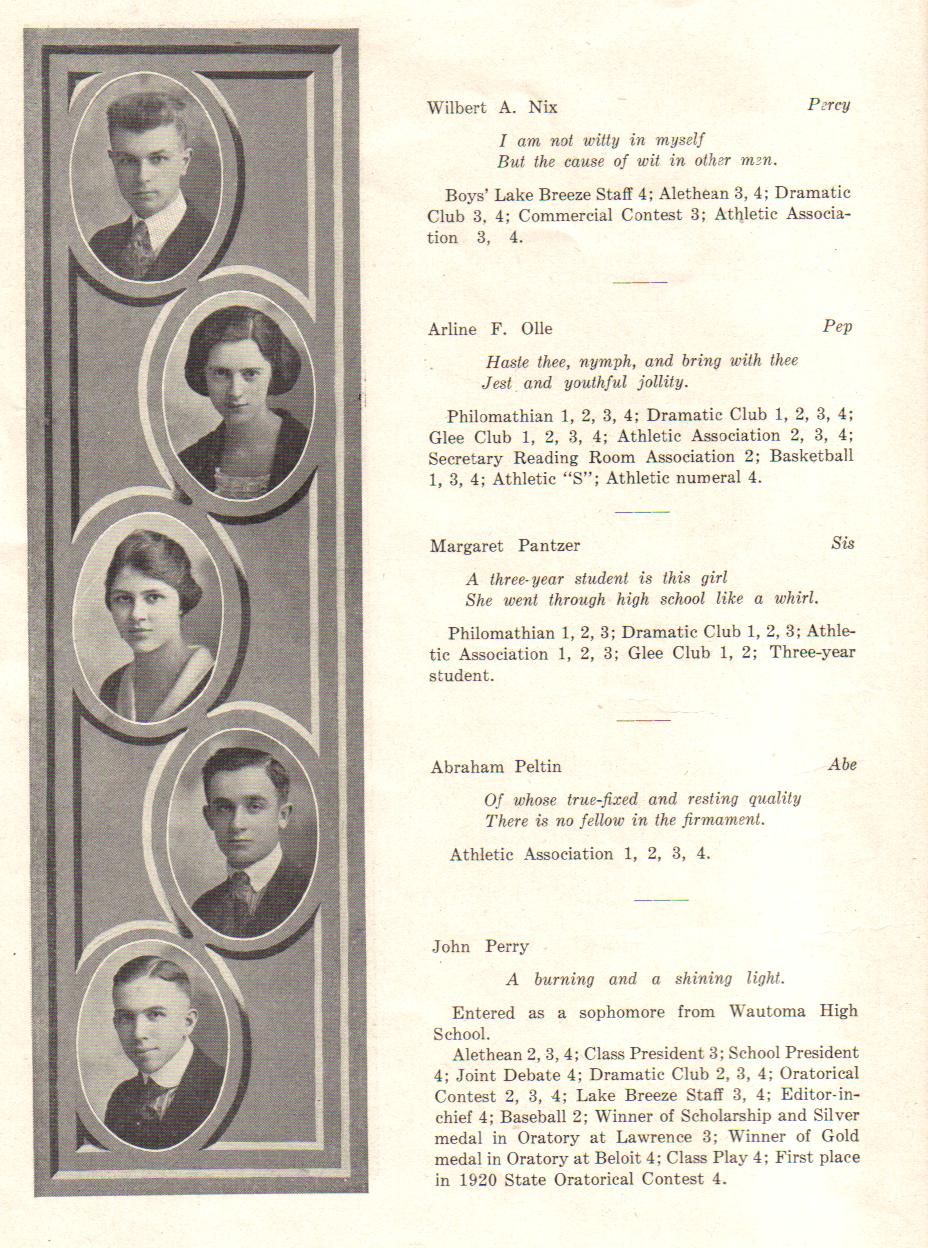 1920 Sheboygan High School, Page 22: Wilbert Nix, Arline Olle, Margaret Pantzer, Abraham Peltin, John Perry.