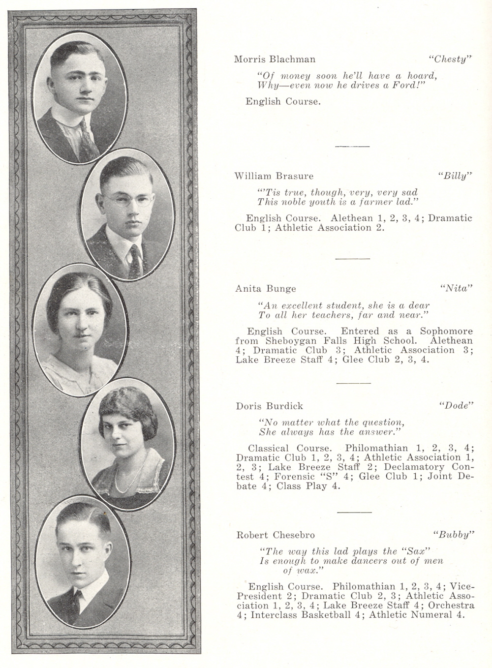 1921 Sheboygan High School, Page 18: Morris Blachman, William Brasure, Anita Bunge, Doris Burdick, Robert Chesebro.