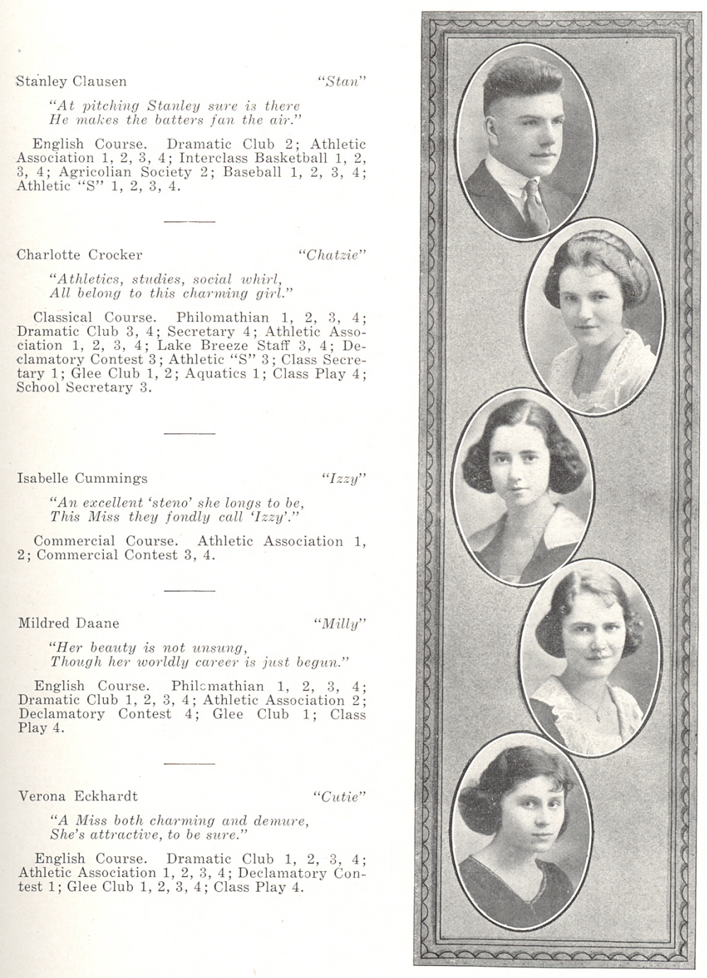 1921 Sheboygan High School, Page 19: Stanley Clausen, Charlotte Crocker, Isabelle Cummings, Mildred Daane, Verona Eckhardt.
