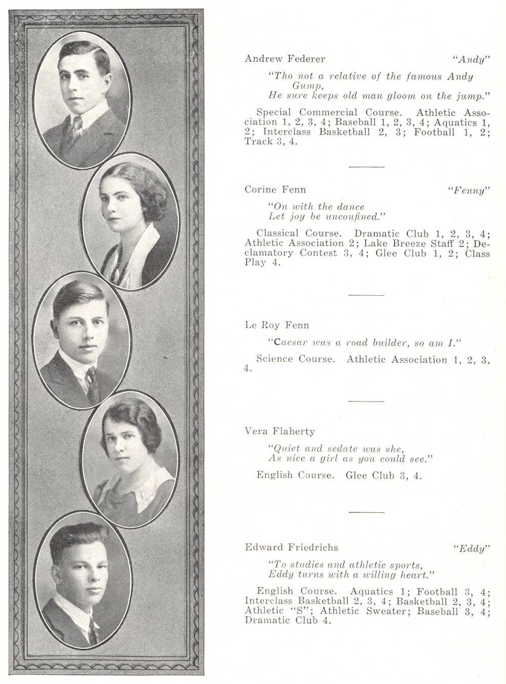 1921 Sheboygan High School, Page 20: Andrew Federer, Corine Fenn, Le Roy Fenn, Vera Flaherty, Edward Friedrichs.