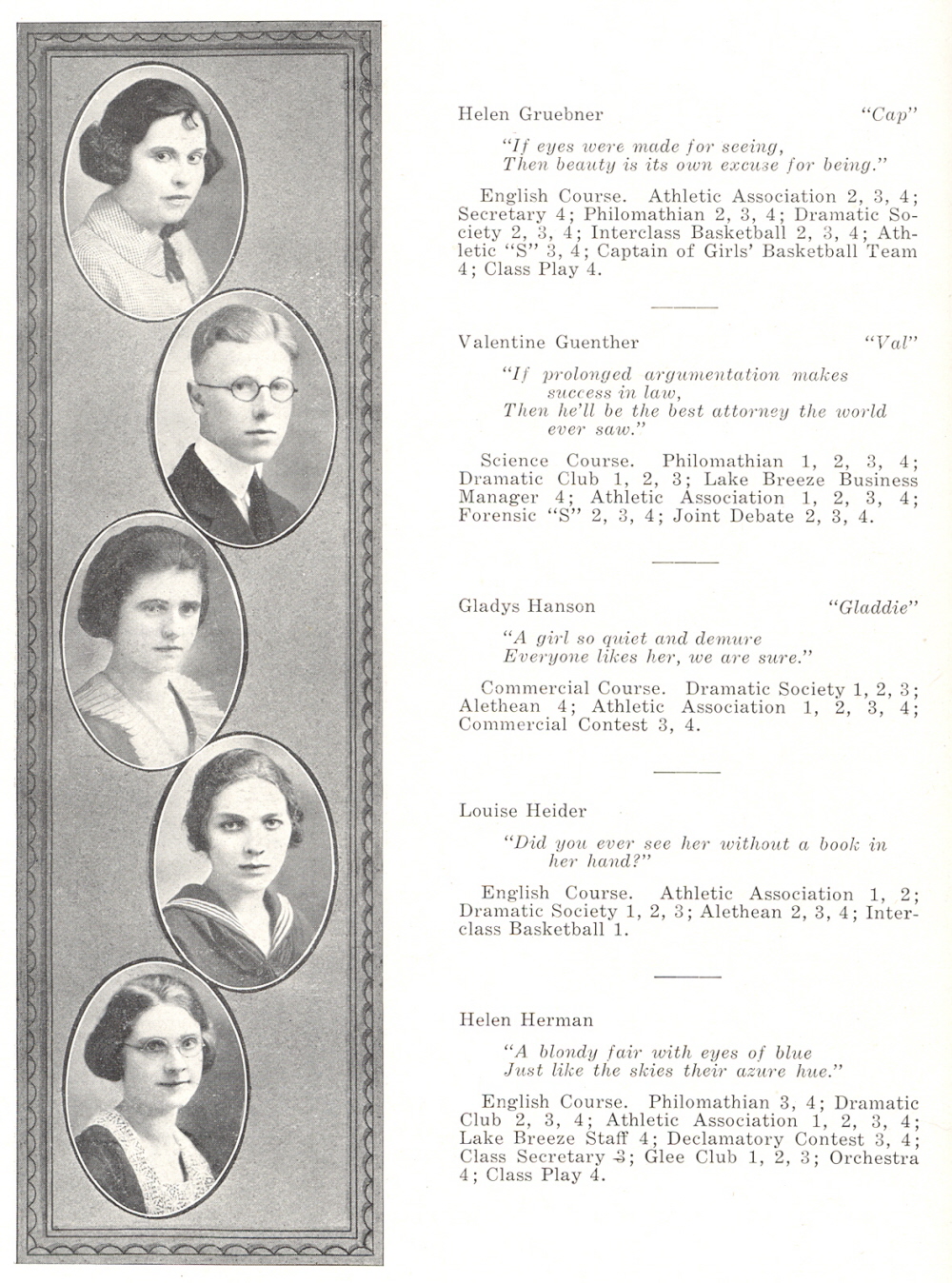 1921 Sheboygan High School, Page 22: Helen Gruebner, Valentine Guenther, Gladys Hanson, Louise Heider, Helen Herman.
