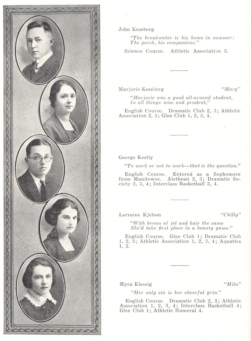 1921 Sheboygan High School, Page 24: John Keseberg, Marjorie Keseberg, George Kestly, Lorraine Kjelson, Myra Klessig.