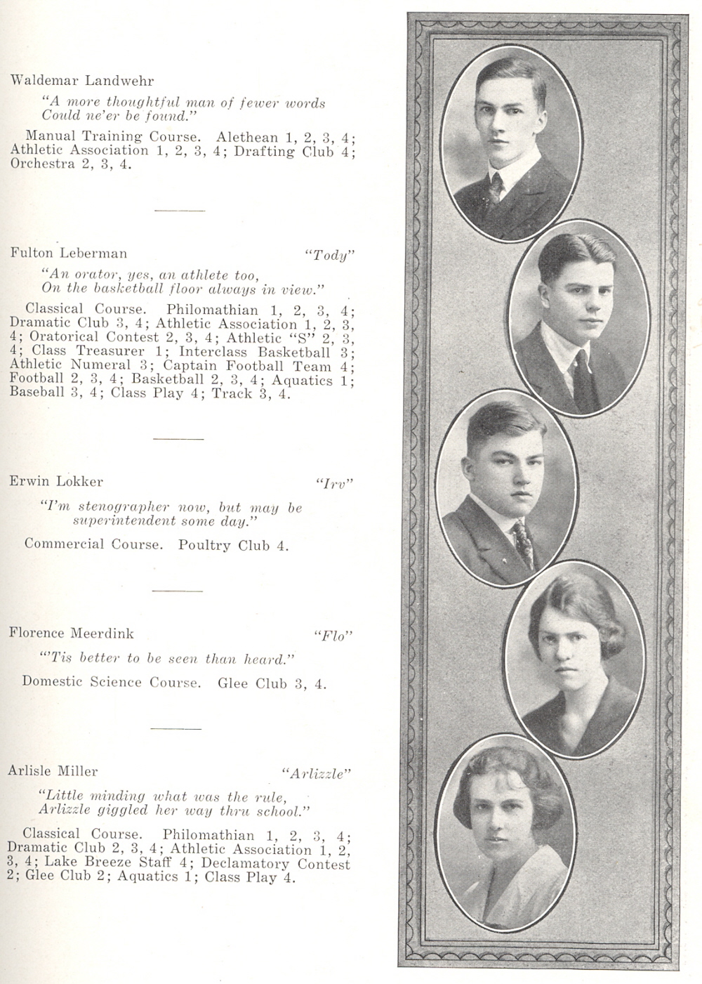 1921 Sheboygan High School, Page 25: Waldemar Landwehr, Fulton Leberman, Erwin Lokker, Florence Meerdink, Arlisle Miller.