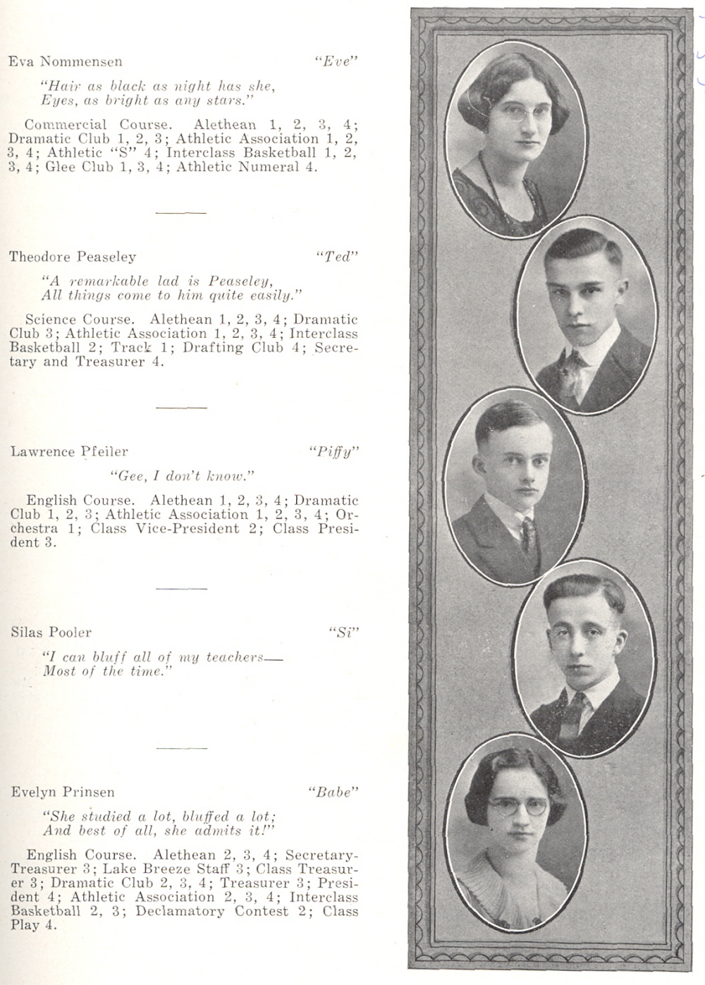 1921 Sheboygan High School, Page 27: Eva Nommensen, Theodore Peaseley, Lawrence Pfeiler, Silas Pooler, Evelyn Prinsen.
