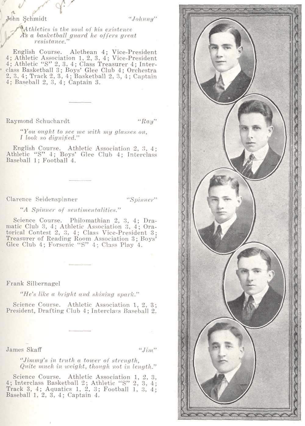 1921 Sheboygan High School, Page 29: John Schmidt, Raymond Schuchardt, Clarence Seidenspinner, Frank Silbernagel, James Skaff.