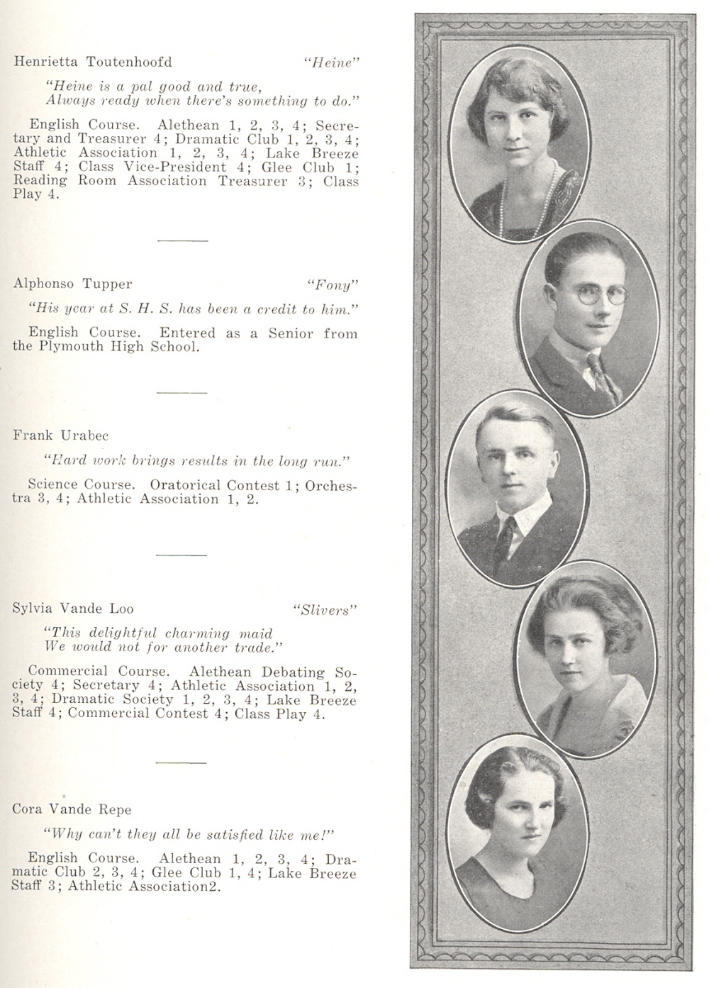 1921 Sheboygan High School, Page 31: Henrietta Toutenhoofd, Alphonso Tupper, Frank Urabec, Sylvia Vande Loo, Cora Vande Repe.
