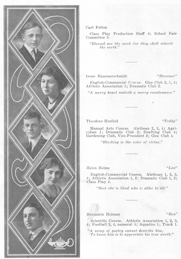 1922 Sheboygan High School, Page 18: Carl Felton, Irene Hammerschmidt, Theodore Hosfeld, Helen Helms, Benjamin Holman.