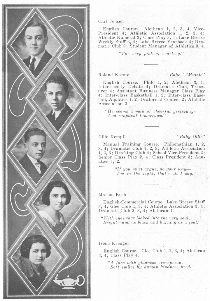 1922 Sheboygan High School, Page 19: Carl Jensen, Roland Karste, Ollie Kempf, Marion Koch, Irene Kreuger.