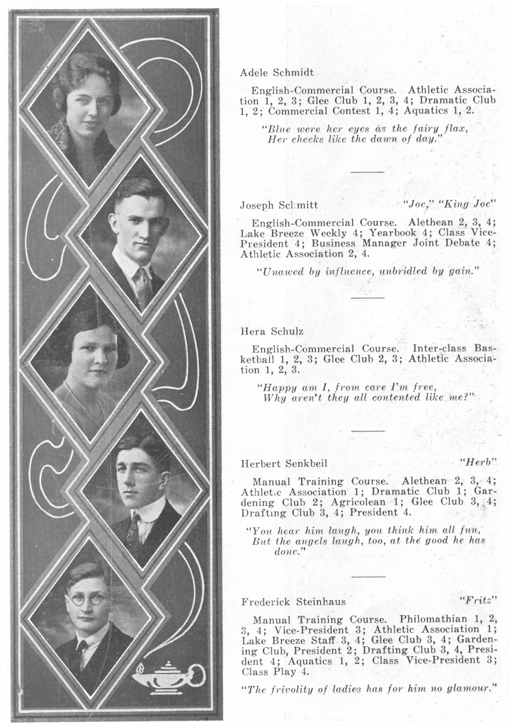 1922 Sheboygan High School, Page 21: Adele Schmidt, Joseph Schmitt, Hera Schulz, Herbert Senkbeil, Frederick Steinhaus.