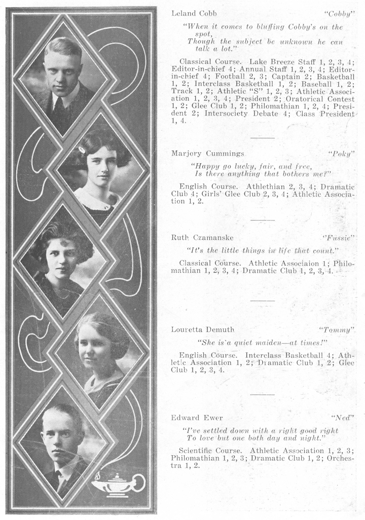 1922 Sheboygan High School, Page 33: Leland Cobb, Marjory Cummings, Ruth Czamanske, Louretta Demuth, Edward Ewer.
