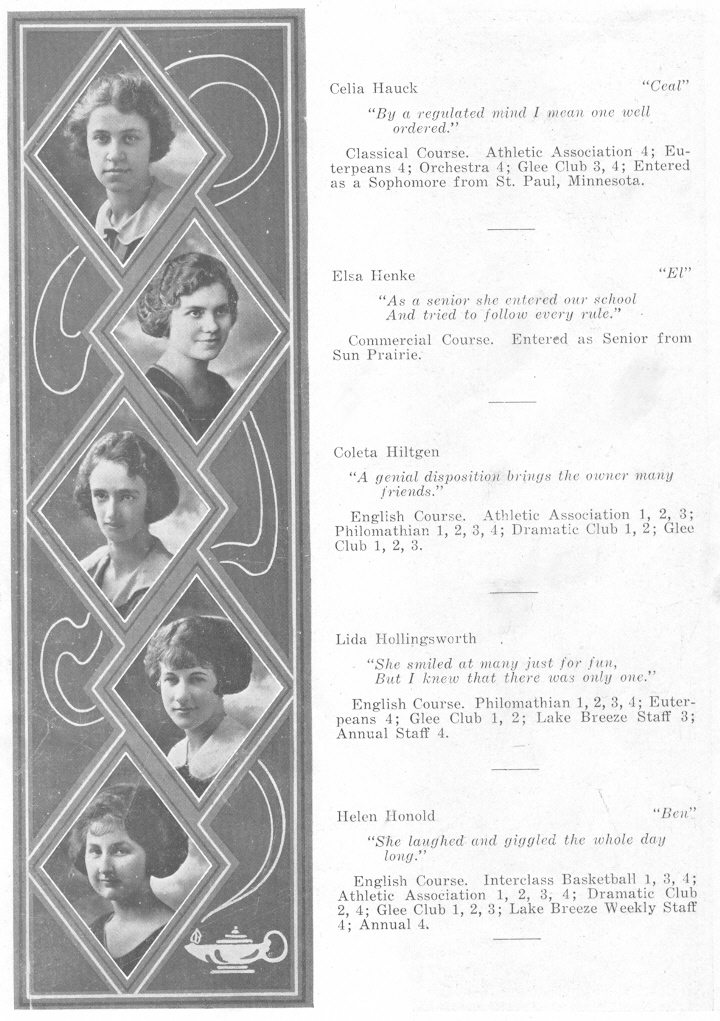 1922 Sheboygan High School, Page 36: Celia Hauck, Elsa Henke, Coleta Hiltgen, Lida Hollingsworth, Helen Honold.