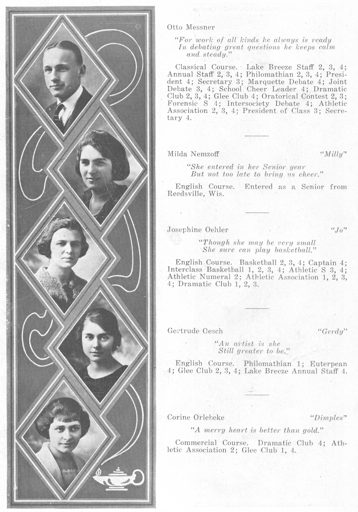 1922 Sheboygan High School, Page 40: Otto Messner, Milda Nemzoff, Josephine Oehler, Gertrude Oesch, Corine Orlebeke.