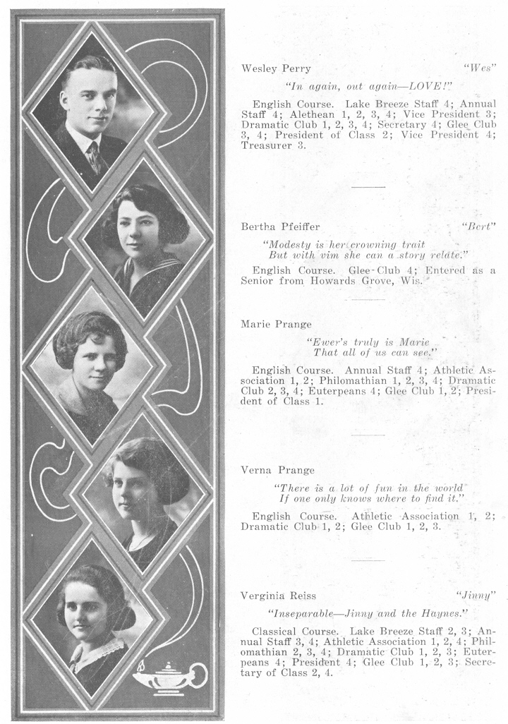 1922 Sheboygan High School, Page 41: Wesley Perry, Bertha Pfeiffer, Marie Prange, Verna Prange, Verginia Reiss.