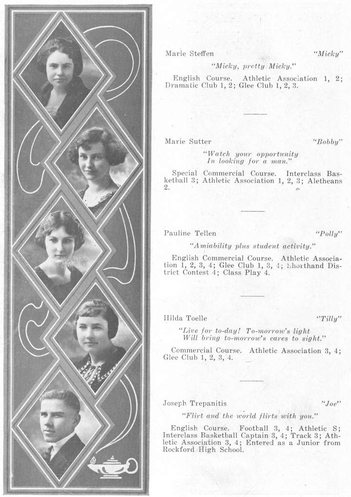 1922 Sheboygan High School, Page 44: Marie Steffen. Marie Sutter. Pauline Tellen. Hilda Toelle. Joseph Trepanitis.