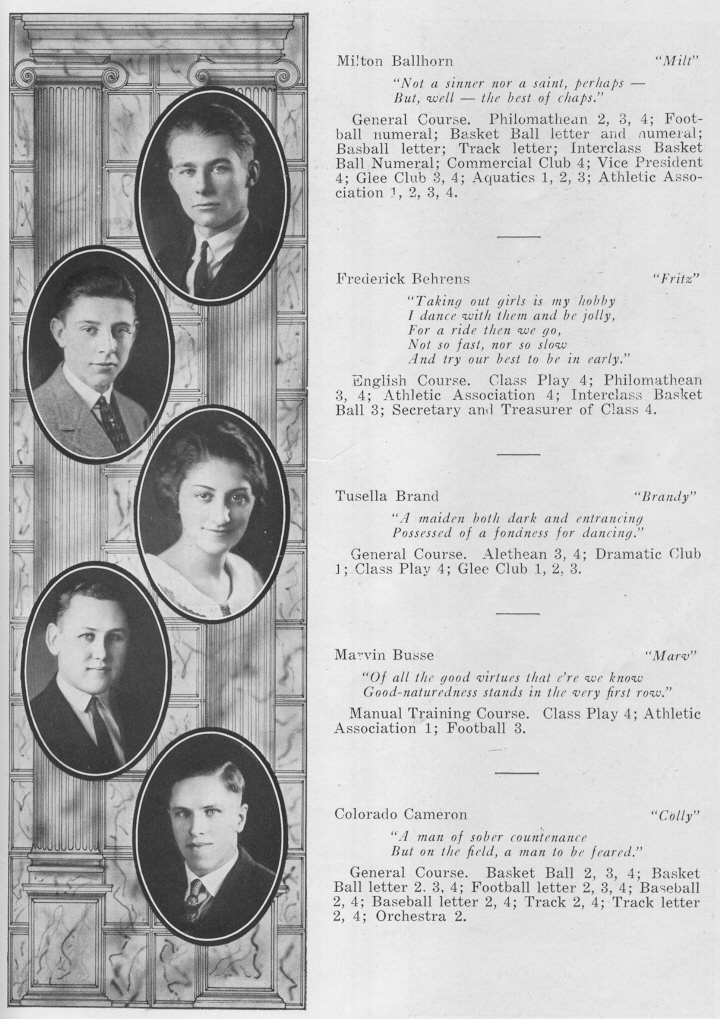 1923 Sheboygan High School, Page 19: Milton Ballhorn, Frederick Behrens, Tusella Brand, Marvin Busse, Colorado Cameron.
